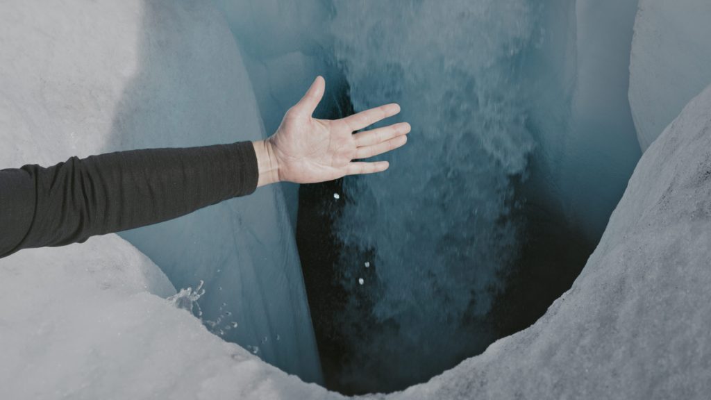 In The Blue Fossil Entropic Stories III, Julian Charrière performs a confrontational act, burning fossil fuels in a futile attempt to melt an iceberg, while in Pure Waste (2021), he explores the reverse: capturing carbon instead of emitting it. Filmed in North Greenland, Pure Waste shows a hand dropping five artificial diamonds, made from captured carbon dioxide and human exhalations, into a glacier shaft. Created during the pandemic, this work poignantly underscores our connection to shared air, as Charrière “returns” carbon to its origins in an act of “pure waste.”