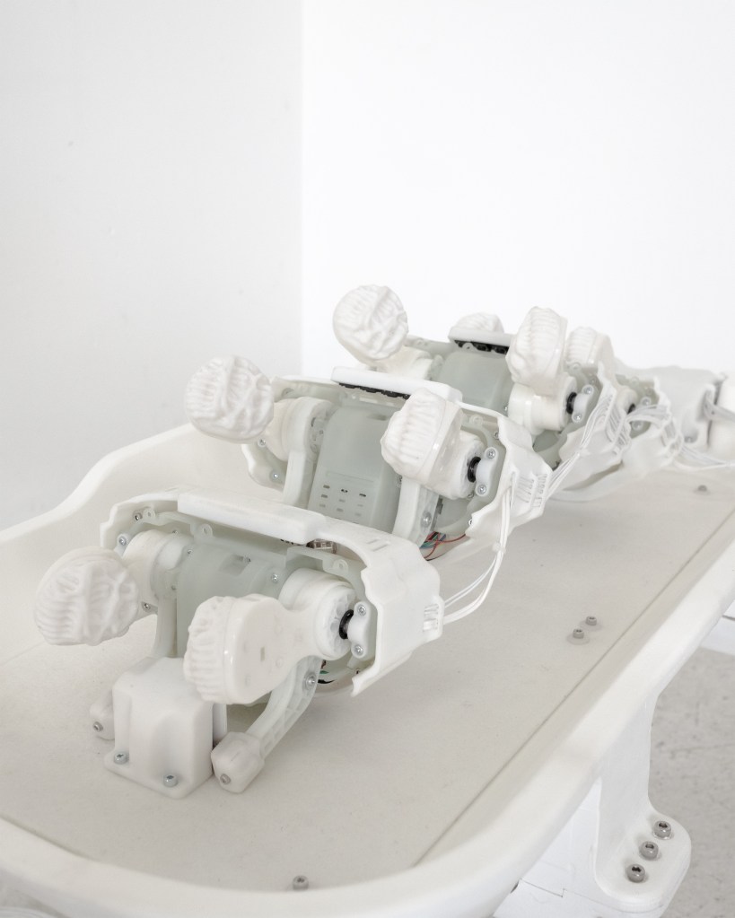 Movement plays a central role because we instinctively distinguish between machines and living beings based on the way they move. I am especially interested in challenging this immediate categorization. I try to create situations where viewers engage with an object as if it were alive—maybe even a child or an animal. But finding the right balance is tricky; I often reach a point where a piece either looks too much like a creature or too much like a machine.