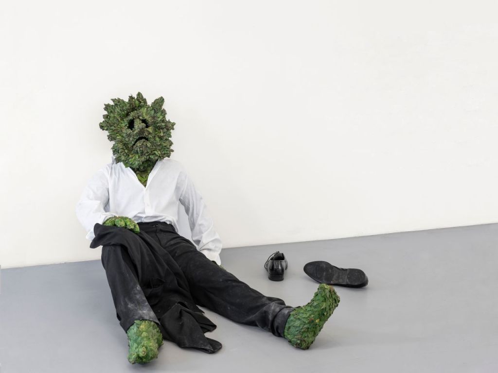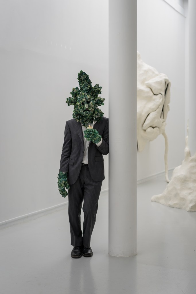 ↑ Vinciola, 2023, silk leaves, alcohol aniline, rice starch, papier mâché, tailor-made wool men’s suits, cotton shirts, zentai lycra suits, bamboo socks, (…), 180 x 50 x 40 cm