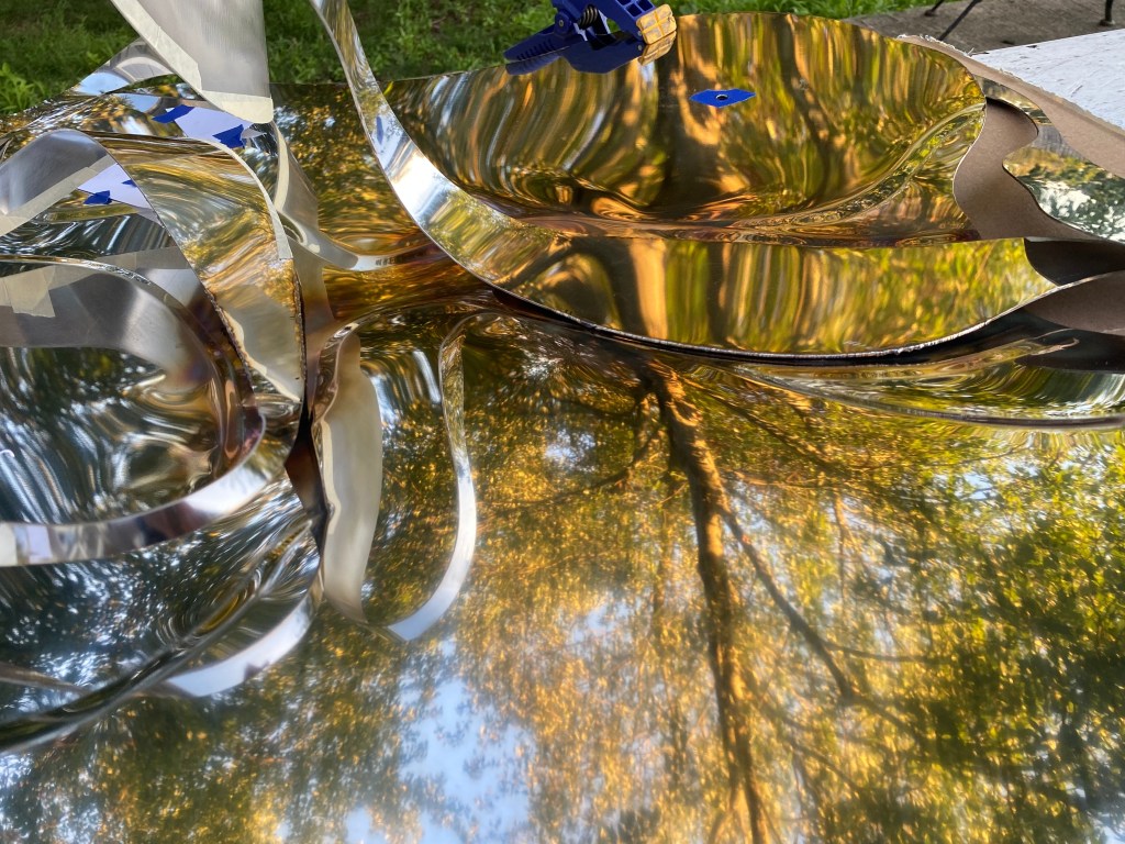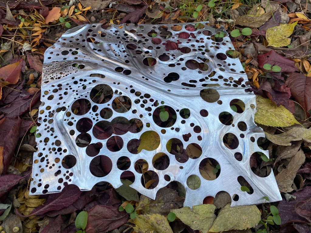 The change in context prompted my series of objects New Layer. In it, I introduce additional layers to metal objects either physically or chemically. In a way, it reflects accretion of my own cultural experiences. Pragmatically, these objects are often small scale—produced of scraps of my large-scale objects, a kind of recycling,—which makes them easily portable, nomadic in a way. There is a large piece within this series, too,— Level Tree sitting on the slope of Cary Hill sculptural park in Salem, NY. Its production process connected me with the local community, its shape is very site-specific, and the different types of metal I layered within this piece make it weather and morph over time.